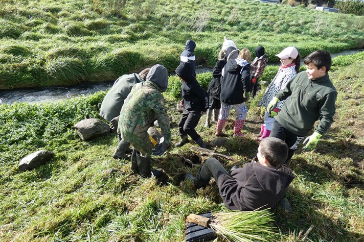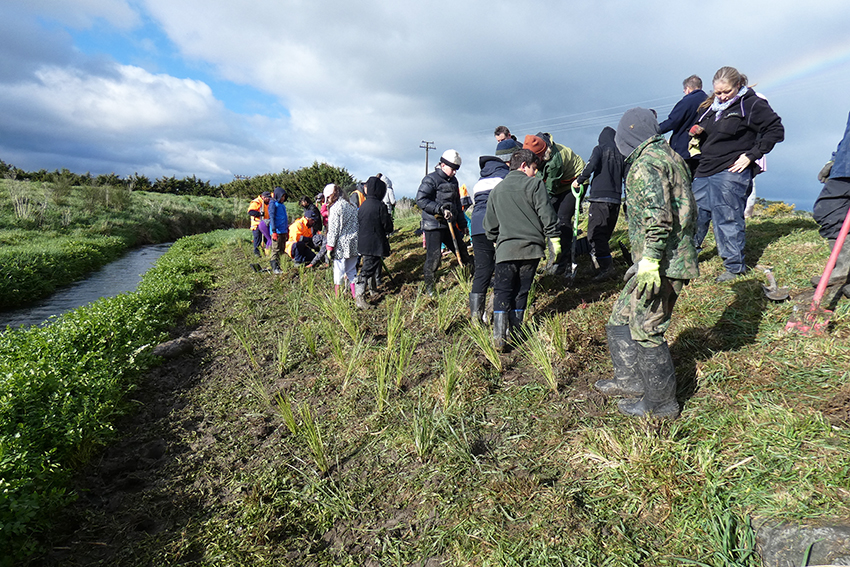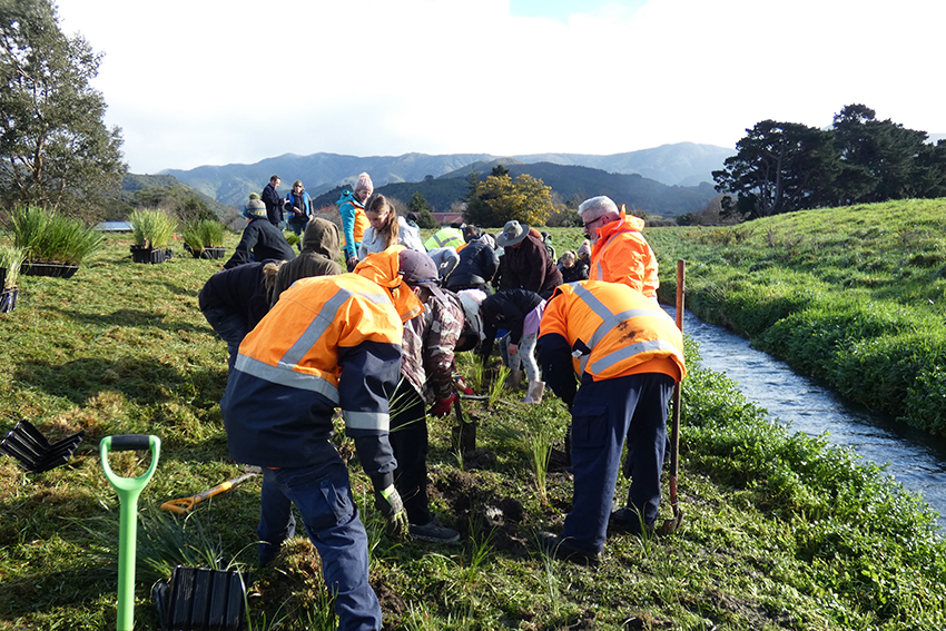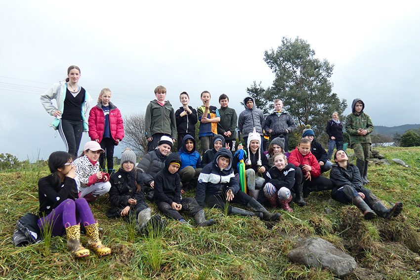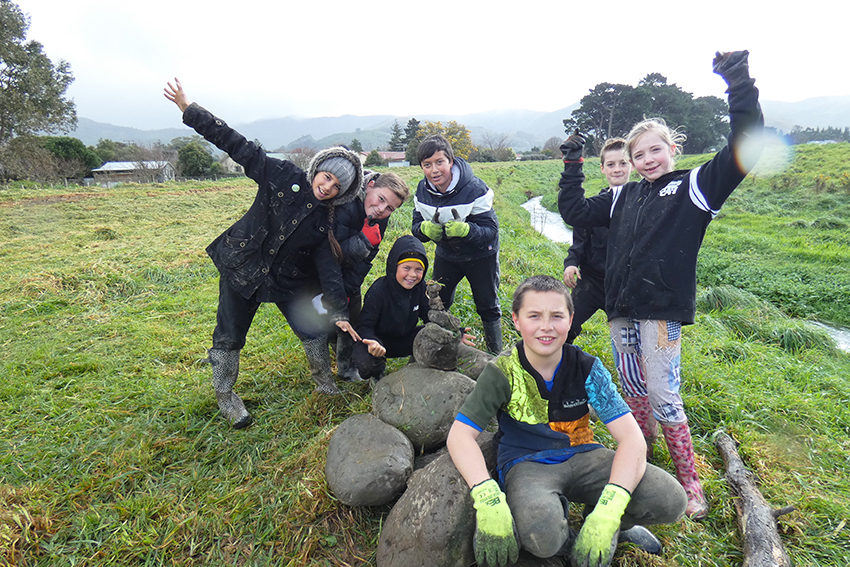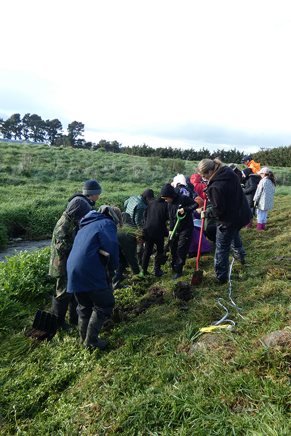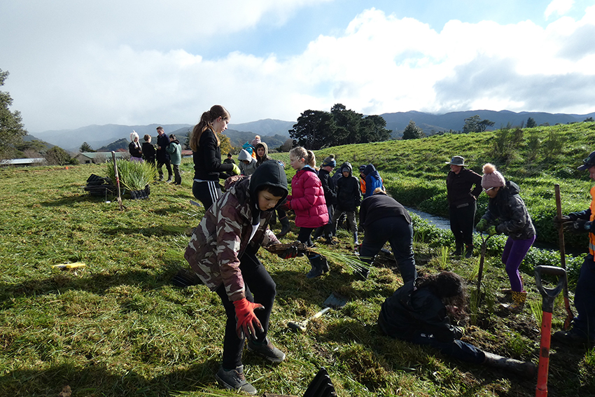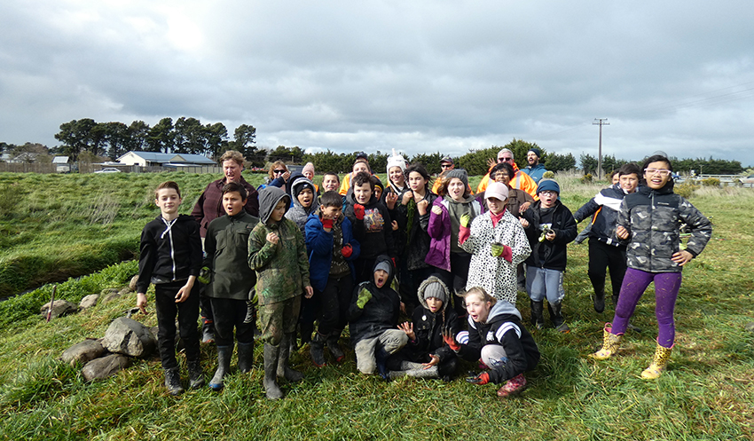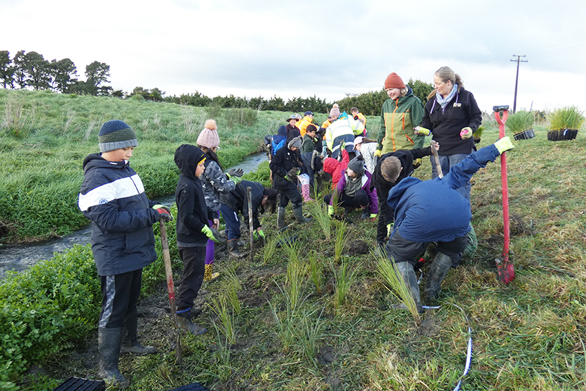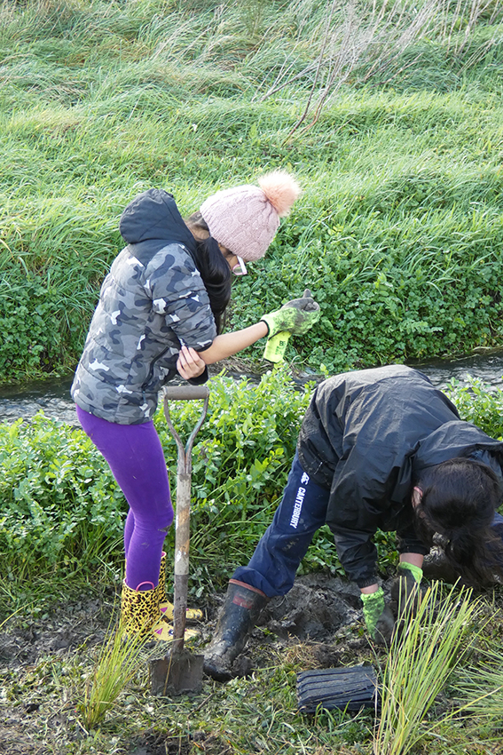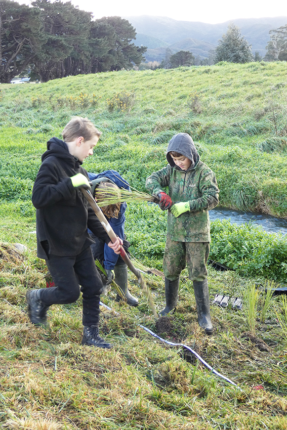 It was wet, windy, overcast, and in the middle of Winter, but none of these conditions deterred the St Teresa’s School students or their enthusiasm for getting their fingers and boots dirty on the first planting day! When I arrived about quarter to ten, the kids and most of the other volunteers were already there, supported by their teacher Liz Lark, Zoe Studd from Mountains to Sea Wellington and a team from City Care, as well as representatives from South Wairarapa District Council. We were later joined by more wonderful volunteers and nearby residents taking a keen interest in this local restoration project!