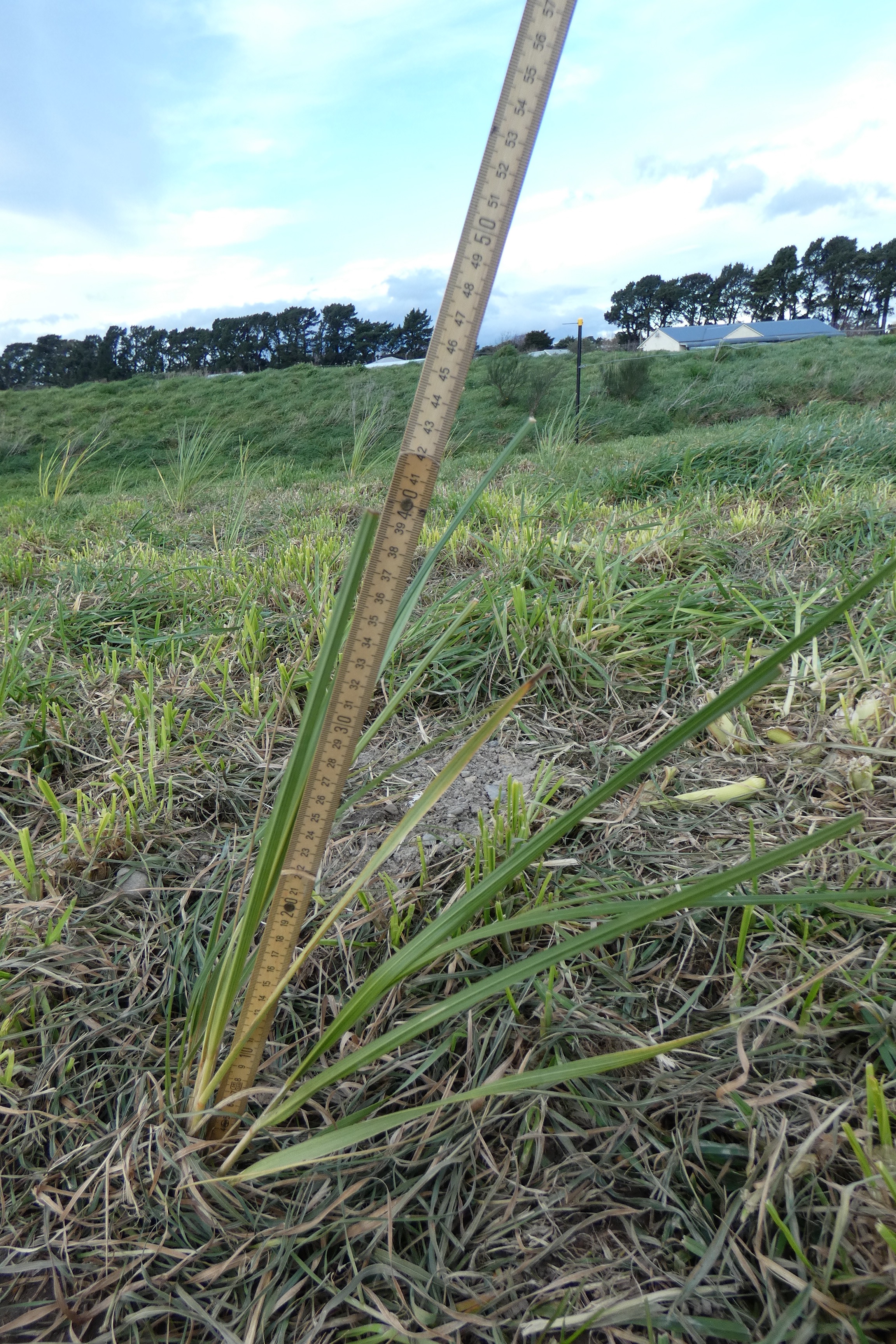 Today I want to measure the temperature of the stream at the site, and the depth of the stream. I also want to record how the plants that the St Teresa Students planted last week are doing. Too nerdy? Well, hey, that way perhaps I can even do a rough monitoring of how the plants grow and thrive. As I walk onto the site, at first glance I can see a few iron rods and a rope marking and protecting the area where the sedges and toetoe were planted. This is a good first step (thanks City Care and SWDC) to ensuring that no-one will trample across the plants, or mow them down.