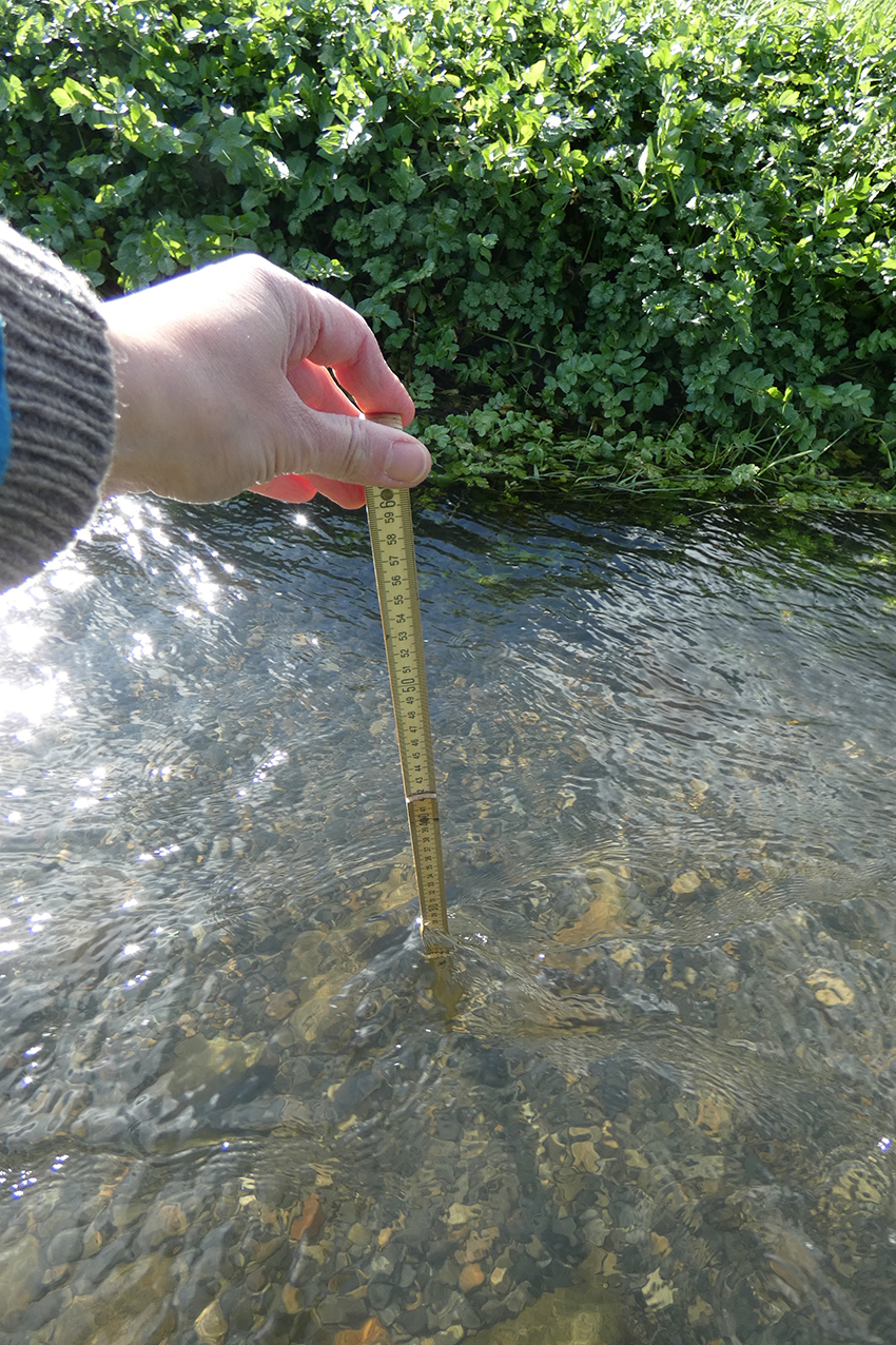 Measuring the temperature can tell you a lot about the stream. The temperature of a stream affects the level of oxygen that fish and macro-invertebrates need to survive, the photosynthesis of aquatic plants in the stream, and vulnerability to pollution, parasites and disease. Of course the temperature of the stream may vary as you wander further upstream and downstream, so key to getting good data is to always take your measurements at the same spot every time. I get approximately 12.2 degrees Celsius. I wait for a bit and take the measurement again, as this is the first time and I am not sure if I am doing this right. To eliminate mistakes it’s best to compare two separate measurements. Both measurements come up the same. I double-check that the thermometer is working by holding the tip of the Thermometer in my hand for a while – it goes up.